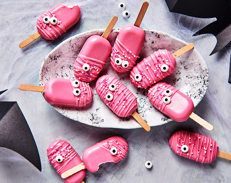 Fira Halloween med söta rosa cakesicles! Med ringlade deco melts och små ätbara ögon blir de perfekta mumieliknande godsaker. Rec...