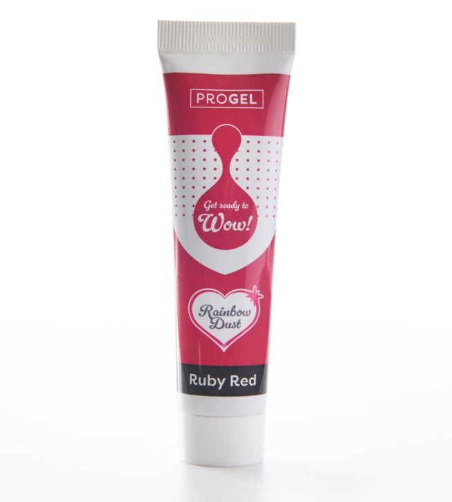 Ruby-röd pastafärg för bakning. Rainbow Dust ProGel är mycket koncentrerad pastafärg med hög standard. Endast en liten mängd Progel krävs för att ge en djup och fyllig färg till sockerpasta, marsipan, smörkräm eller kaksmet. Pastafärgen kommer i en praktisk tub, vilket minimerar spill och kladd.