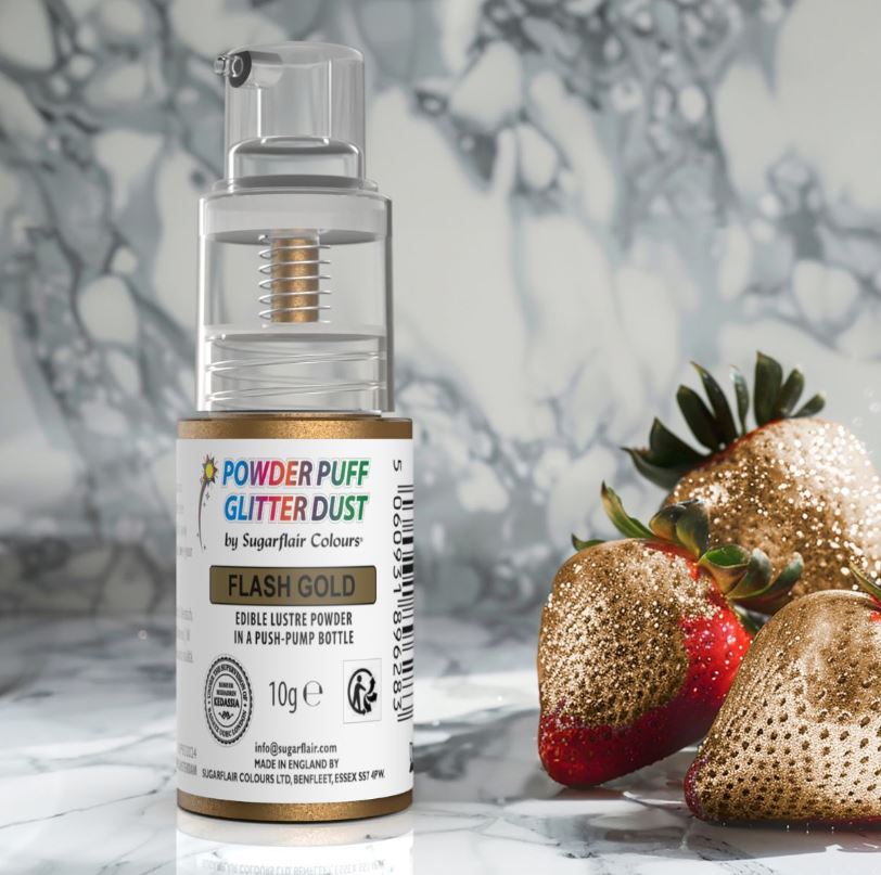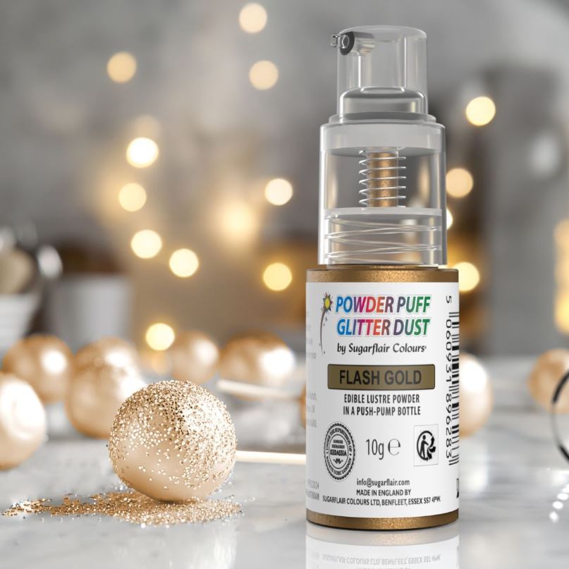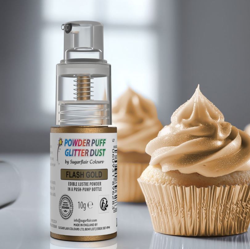 Pumpspray med glittrig guldfärg från Sugarflair. Med sin innovativa pumpdesign är det enkelt att applicera det glittrande pulvret jämnt och fint på tårtor, cupcakes och andra desserter. Tillverkad med högkvalitativa ingredienser garanterar Sugarflair Powder Pump en långvarig och imponerande finish.