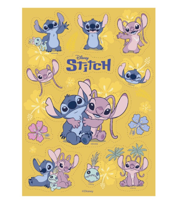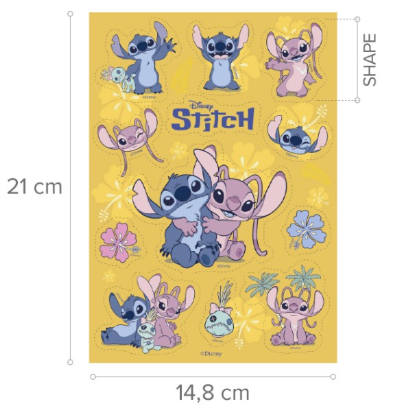 Waferark med Disneys Stitch och Angel i olika former. Perfekt för att dekorera tårtor, cupcakes och andra bakverk på barnkalaset.