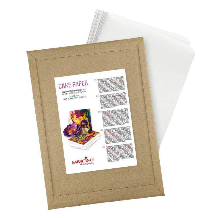 Ätbart, formbart tårtpapper från Saracino gjort av vegetabiliska fiber. Varje papper är i A4-storlek och kan användas på båda sidor. Sidorna skiljer sig åt i strukturen där den ena är slät och den andra grov vilket möjliggör olika typer av resultat. På tårtpapperet kan du måla direkt med ätbara färger. Du kan också använda arken i skrivare avsedda för livsmedel.