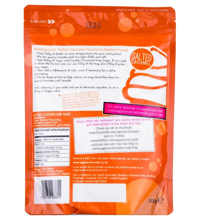 Florsocker med smak av saltkola från Sugar & Crumbs. Det smaksatta florsockret passar perfekt för användning i smörkräm, maränger, macarons, cheese cakes osv. Byt bara ut receptets vanliga socker eller florsocker mot det smaksatta – ett smidigt sätt att få både sötma och smak i ett enda steg.