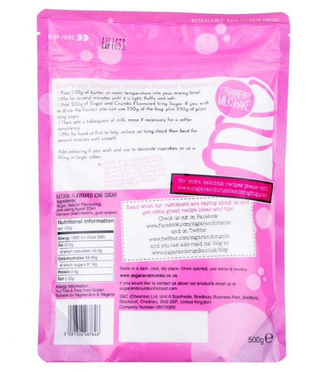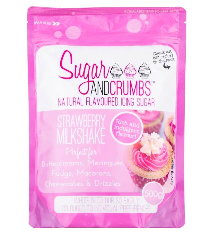 Florsocker med smak av jordgubbsmilkshake från Sugar & Crumbs. Det smaksatta florsockret passar perfekt för användning i smörkräm, maränger, macarons, cheese cakes osv. Byt bara ut receptets vanliga socker eller florsocker mot det smaksatta – ett smidigt sätt att få både sötma och smak i ett enda steg.