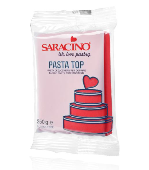 Saracinos Top paste är speciellt framtagen för att täcka tårtor. Sockerpastan är oerhört elastisk och hållbar och du kan kavla den så tunt som till 1 mm. Här i röd färg.