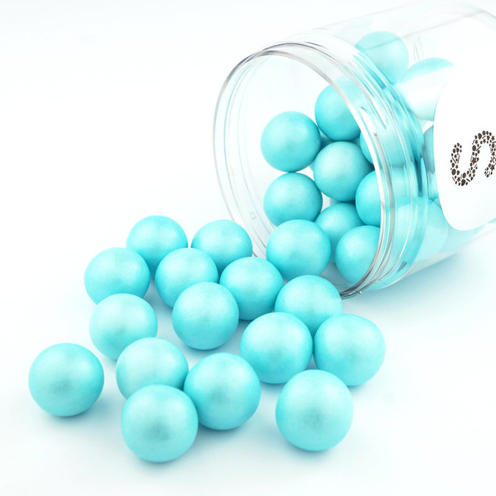Stora blå strösselkulor från Super Streusel. Strösselkulorna är täckta med choklad och har en crunchig mitt.