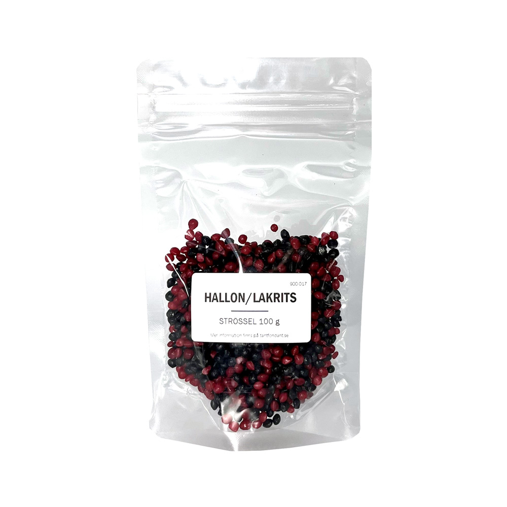 Med våra strössel i påse har du chans att njuta av dina favoritsmaker från glasskiosken i hemmaköket. Detta strössel består av små fudgekulor med den oslagbara smakkombinationen hallonlakrits. Förutom som topping på mjukglassen passar strösslet utmärkt som dekoration på desserter och bakverk.