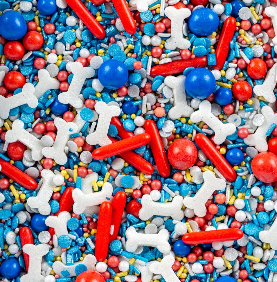 Det här är StreuselMix för alla fyrbenta vänner! Blandningen med de söta benformade strösslen är perfekt för födelsedagstårtor, muffins och desserter, särskilt när temat är Paw Patrol eller andra djurteman. Blå och vita konfettiströssel, gula nonpareilles och blå och röda chokladkulor gör detta till ett riktigt partyhöjdpunkt för alla valpälskare.
