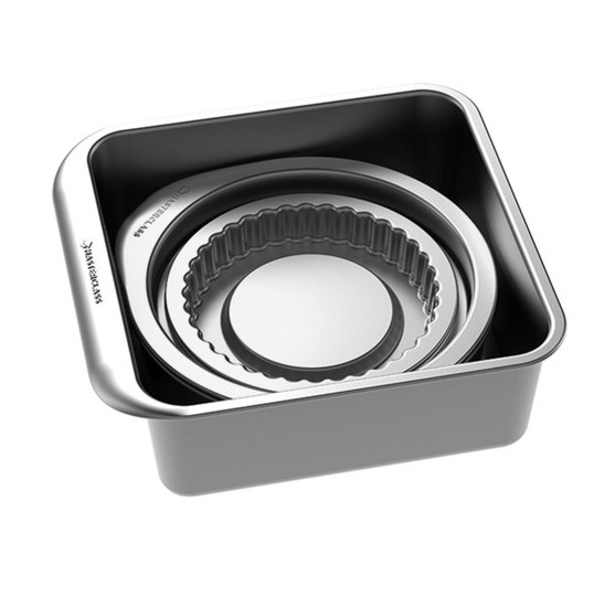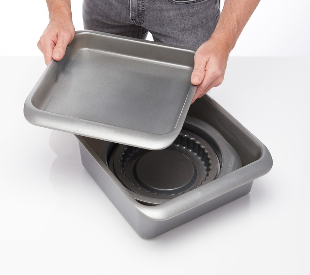 I setet ingår brownieform, pajform med lös botten, quicheform, sandwichform, två runda bakformar samt en fyrkantig ugnsform. Med formarna kan du baka allt från saftiga mjuka kakor och tårtbottnar till pajer och brownies.
