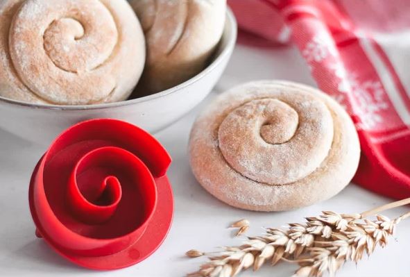 Ge dina hembakade frallor det klassiska virvel-mönstret – precis som från bageriet! Forma degen till bollar, platta till dem lätt och tryck stämpeln i degen. Efter jäsning bakas frallorna som vanligt och får det traditionella, vackra mönstret.
