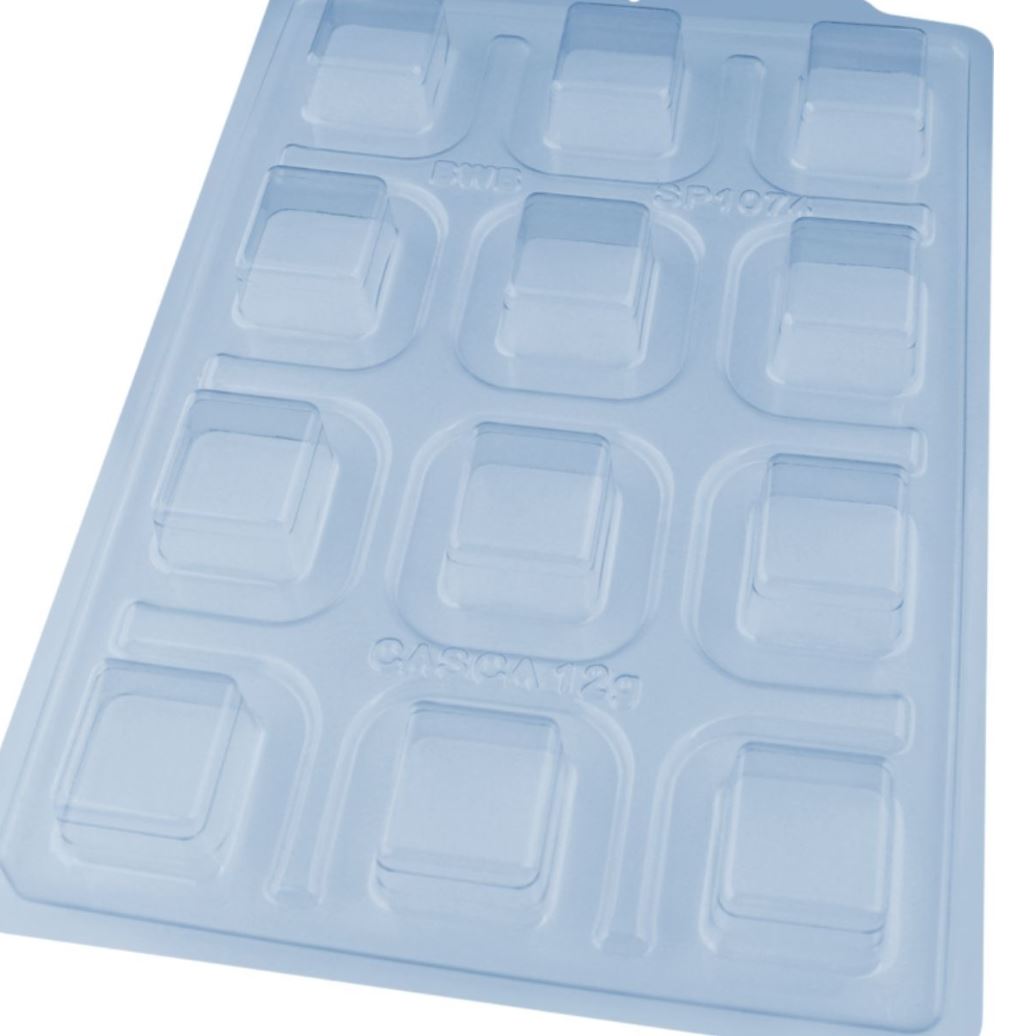 3-delad pralinform från BWB för att gjuta fyrkantiga praliner. Pralinformen har en markering som indikerar den nödvändiga chokladmängden och tack vare insatsen i silikon fylls alla pralinskal jämnt och snyggt. Med BWBs pralinformar kan du uppnå perfekta resultat utan att slösa på värdefull choklad.