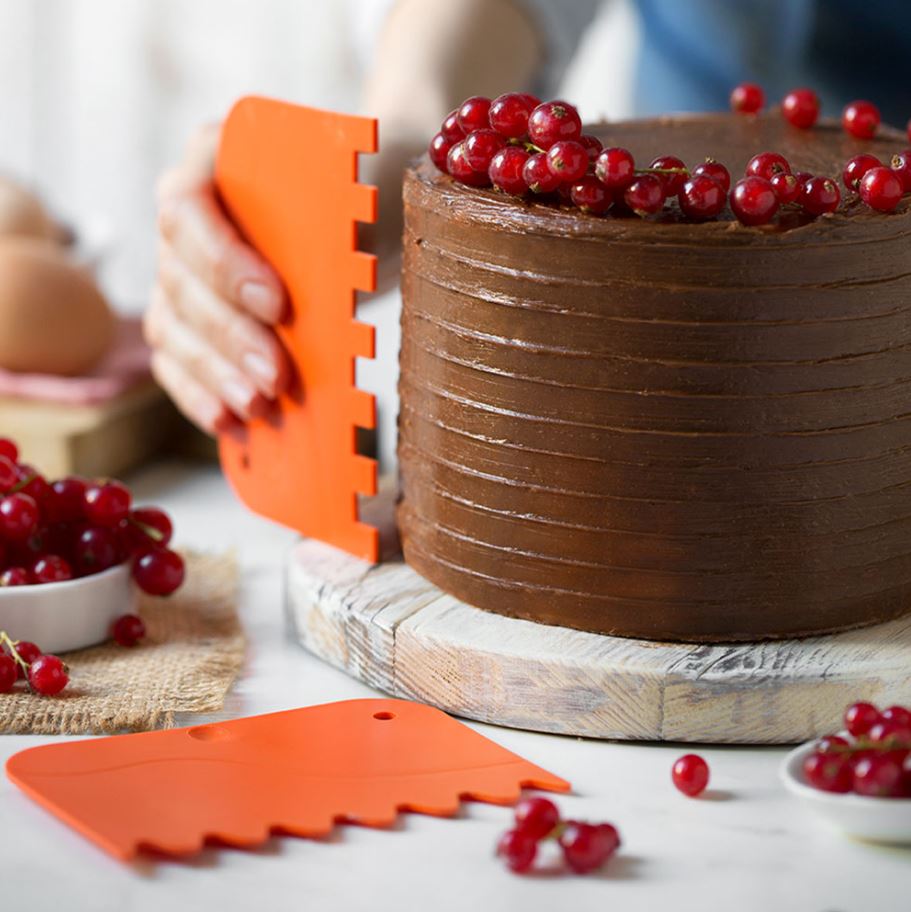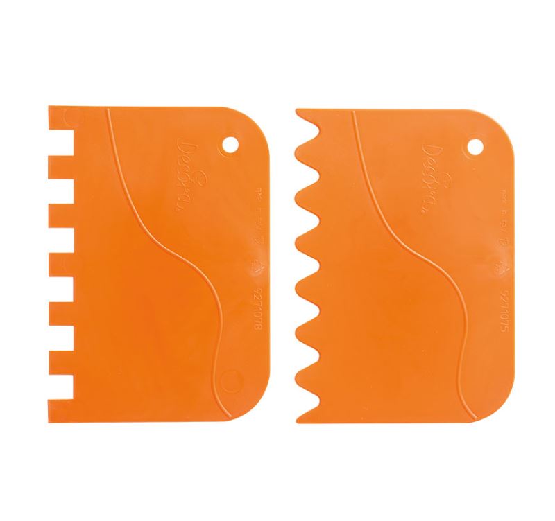 Två tårtskrapor i plast för att skapa olika mönster på dina tårtor och bakverk. Perfekt för frosting, choklad, smörkräm och grädde. Ena sidan av skrapan skapar mönster av ränder eller vågor, medan den andra sidan är helt slät för en jämn finish.