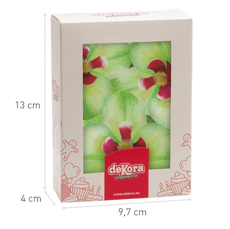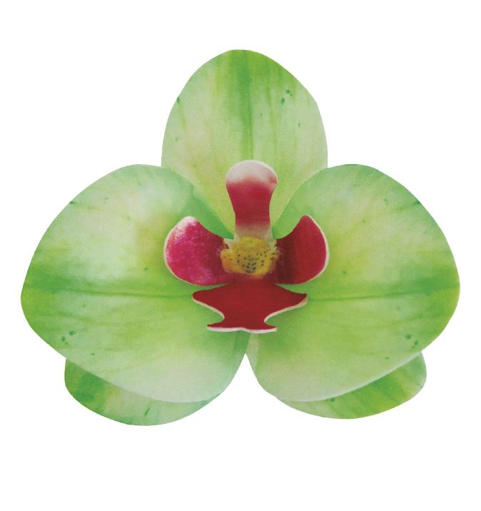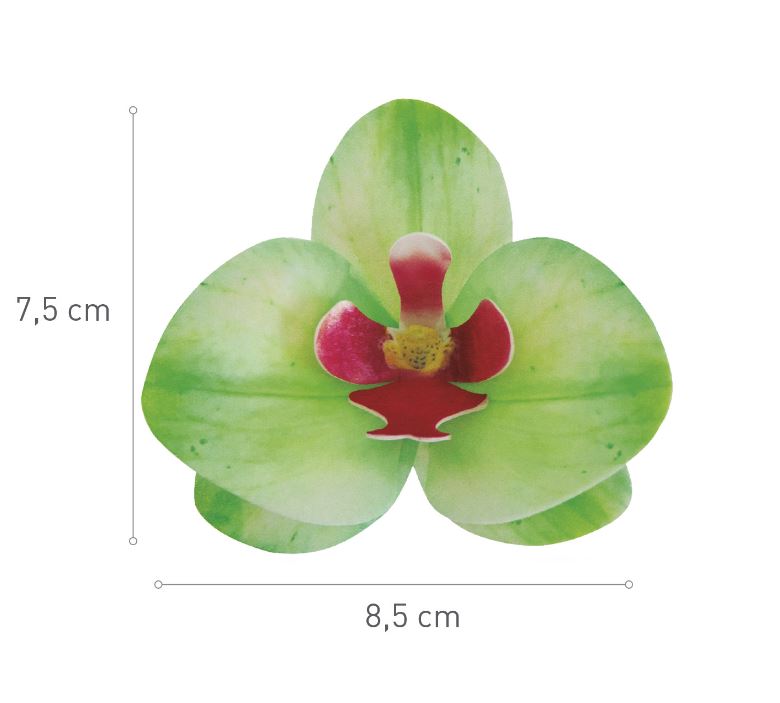 Ätbara gröna orkidéer med röd mitt, gjorda av waferpapper. Blommorna är hela 8,5-7,5 cm stora och vackra att använda som dekoration på bröllopstårtan, födelsedagstårtan m.m.