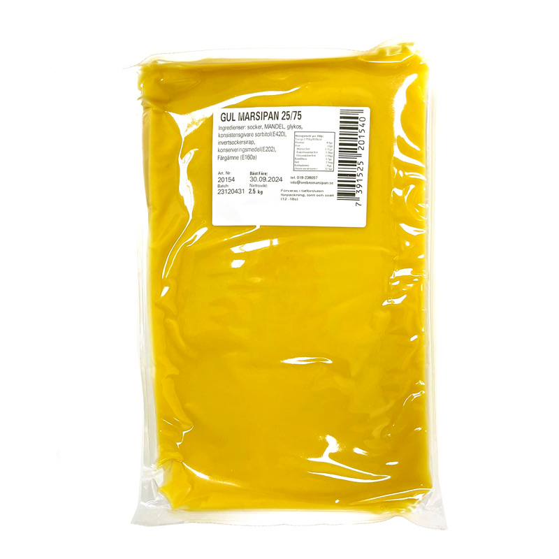 Gul svensktillverkad marsipan från Örebro Bagerivaror. Här i stor förpackning med hela 2,5 kg. Marsipanen är av hög kvalitet och enkel att kavla ut och modellera med. Med sin följsamhet och goda smak är marsipan från Örebro Bagerivaror ett populärt val till tårtor och modelleringar.