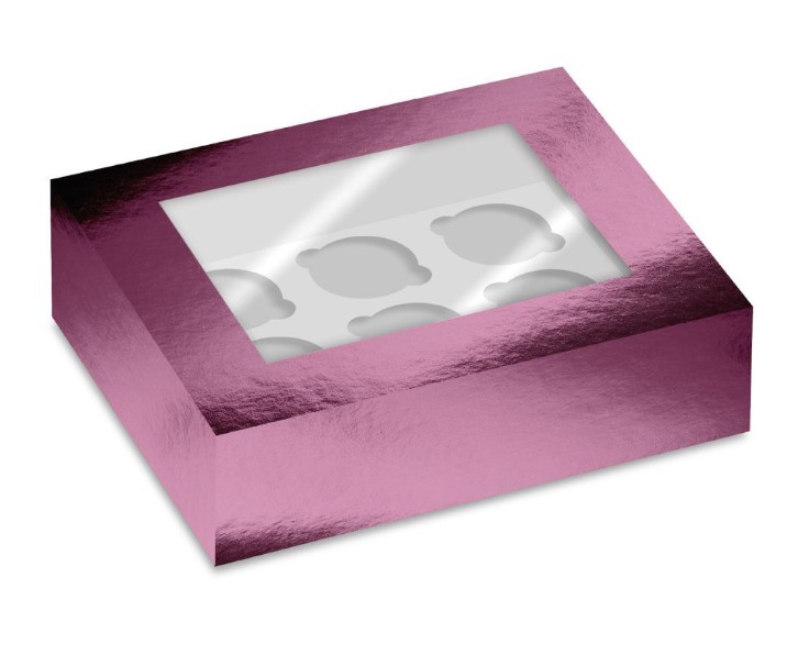 Cupcakes-boxar i rosa metallic med genomskinligt lock.