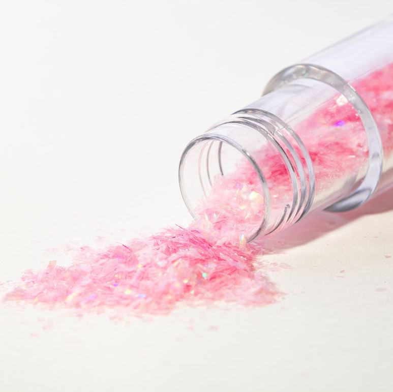 Rosa ätbara glitterflingor, redo att strös över tårtor, choklad och bakverk för en glittrig effekt.