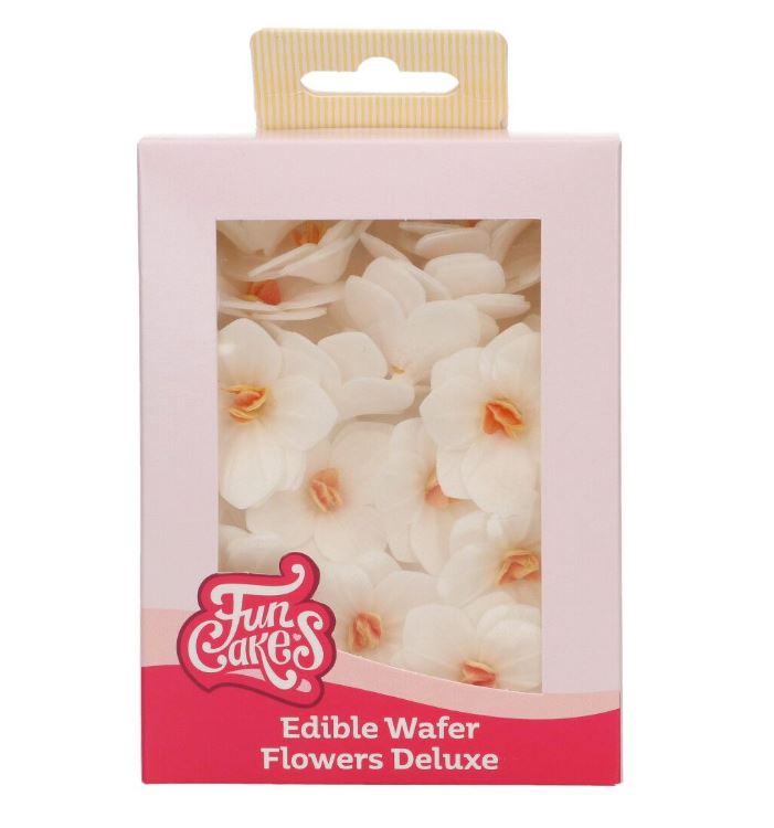 Ätbara waferdekorationer i form av vackra vita blommor med gul mitt. Waferblommorna passar perfekt som dekoration på studenttårtor, bröllopstårtor och andra eleganta bakverk. Använd en och en eller placera flera blommor tillsammans för en bukett-effekt. 18 blommor ingår i förpackningen.