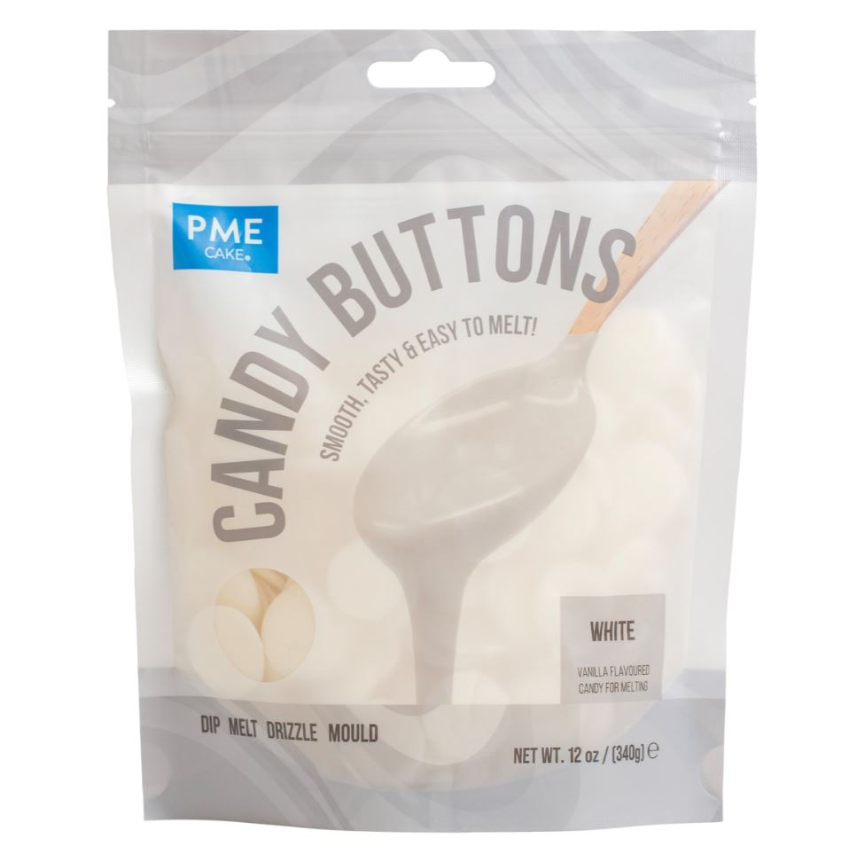 Vita Candy Buttons från PME med god vaniljsmak. Meltsen är enkla att smälta och passar perfekt för att skapa drip-effekter på tårtor, doppa godis, täcka cake pops, fylla chokladformar eller ringla över desserter och frukt.