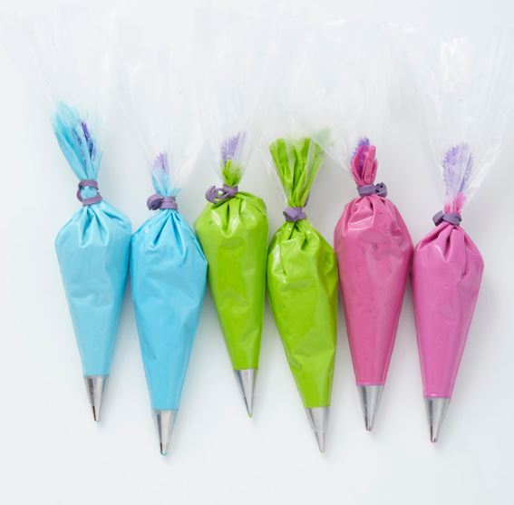 Gör så här: Snurra påsen så att den försluts och linda sedan bandet runt påsen för att säkra det. Flytta gummibandet nedåt i takt med att du spritsar för att bibehålla konstant tryck. Dessa band fungerar med alla storlekar av påsar och kan användas på både engångs- och flergångspåsar.