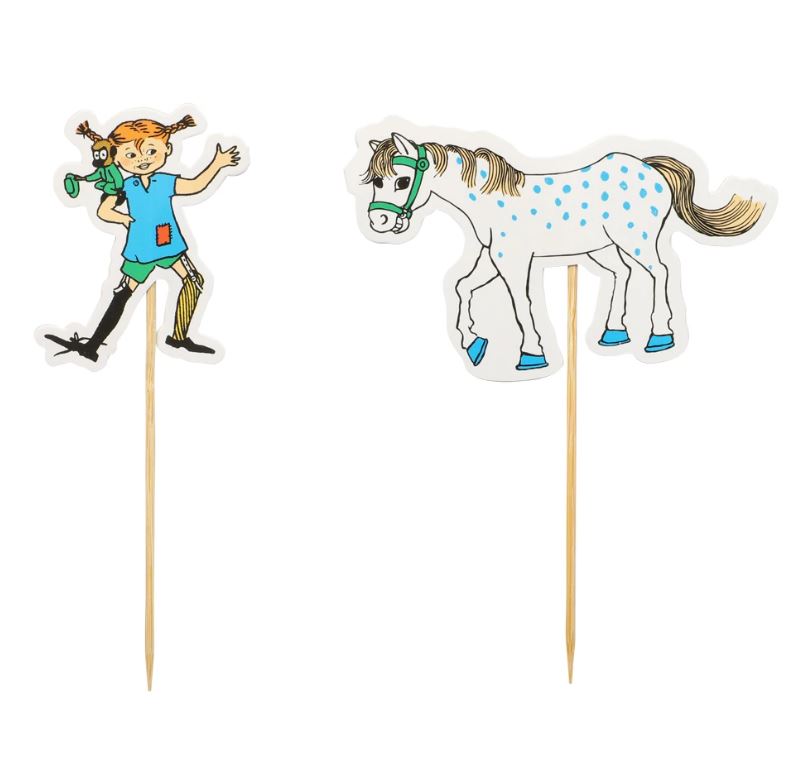 Ska du baka en tårta till Pippi-kalaset? Med dessa toppers fixar du snabbt och enkelt en Pippi-tårta med hästen Lilla Gubben och Pippi Långstrump själv förstås. Varje topper är gjord av papper och fästs på tårtan med en träpinne.