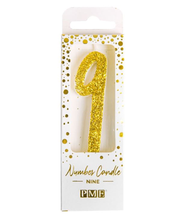Glittrigt sifferljus med siffran 9 i modernt typsnitt, en festlig detalj till födelsedagsfirandet. Själva siffran är ca 8 cm hög och sitter på en träpinne - redo att sättas ned i tårtan.