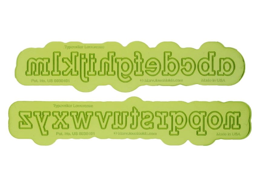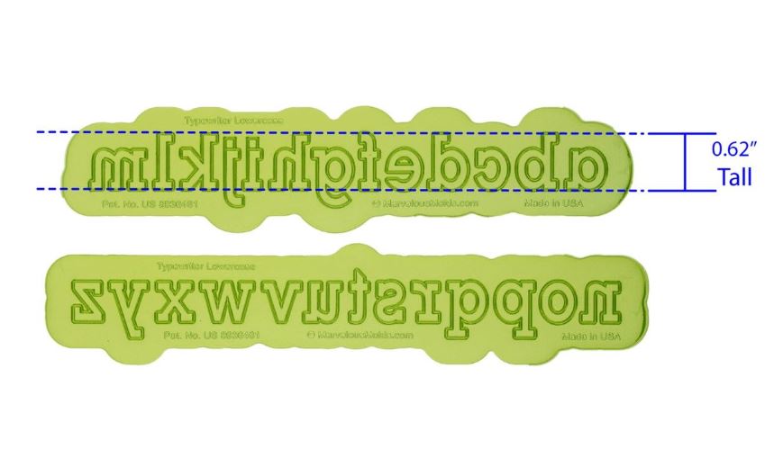 Små bokstäver i klassiskt typsnitt i smart silikonutstickare från Marvelous Molds. Det flexibla materialet gör det enkelt att dekorera tårtan med text.