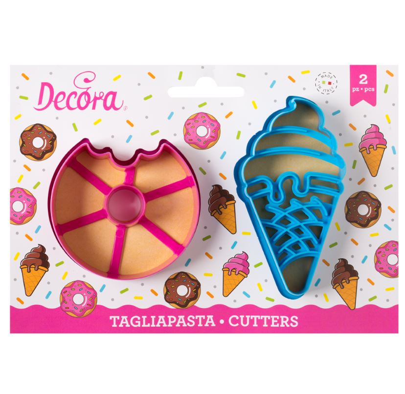 Set med två cookie cutters av plast för att skära ut perfekta former ut kakdeg, sockerpasta, marsipan och andra ätbara massor. Just det här setet skapar en läcker munk och en glasstrut. Glasstruten har också tillhörande mönsterprägling som skapar detaljer i degen samtidigt som du skär ut formen. För att få jämnare kanter kan du mjöla formen innan användning.