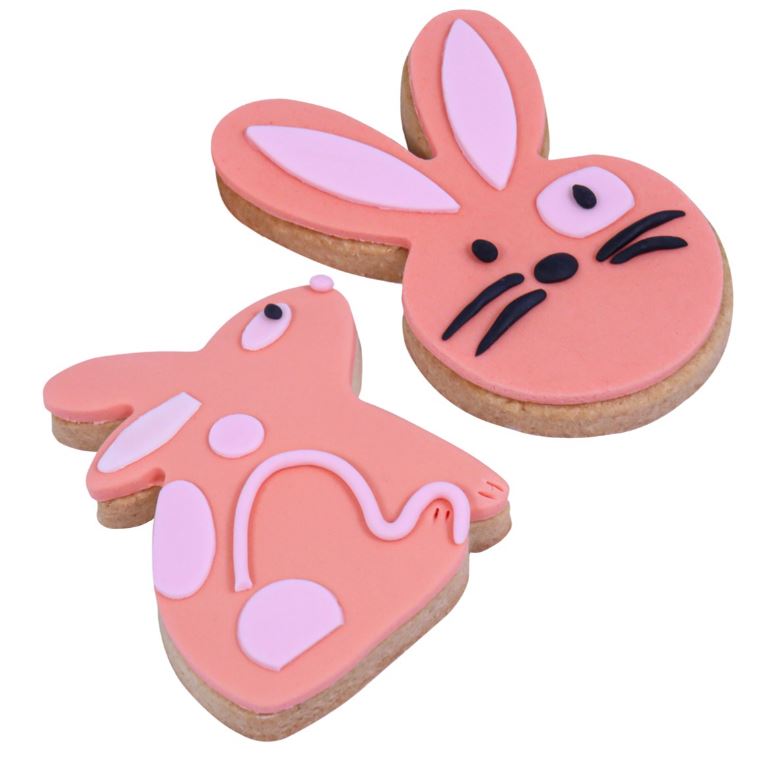 Charmiga utstickare från PME för att skapa kakor och ätbara dekorationer formade som kaniner. I setet ingår två olika utsickare i rosa metall. Varje utstickare är ca 9 cm bred, perfekt till påskens bakverk!