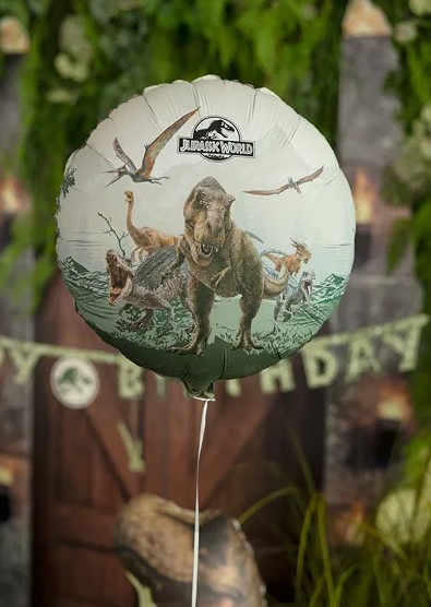 Dekorera dinosauriekalaset med en rund folieballong med Jurassic World-motiv.