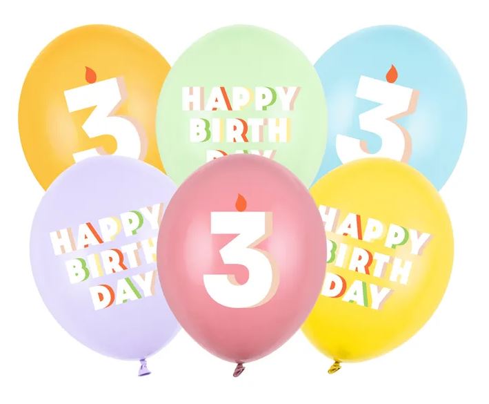 Fira födelsedagen med stil med dessa färgglada ballonger med texten "Happy Birthday" och siffran 3. Setet innehåller sex olika pastellfärger: Pastel Pistachio, Pastel Wild Rose, Pastel Honey Yellow, Pastel Light Blue, Pastel Light Lilac och Pastel Honey. Ballongerna har tryck på båda sidor och en diameter på ca 30 cm.