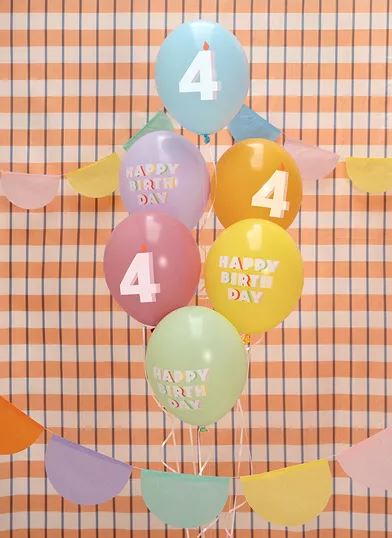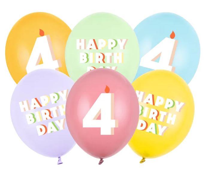 Fira födelsedagen med stil med dessa färgglada ballonger med texten "Happy Birthday" och siffran 4. Setet innehåller sex olika pastellfärger: Pastel Pistachio, Pastel Wild Rose, Pastel Honey Yellow, Pastel Light Blue, Pastel Light Lilac och Pastel Honey. Ballongerna har tryck på båda sidor och en diameter på ca 30 cm.