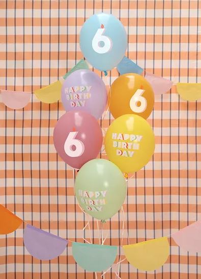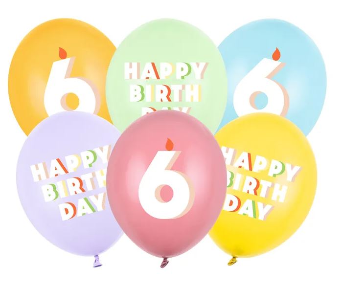 Fira födelsedagen med stil med dessa färgglada ballonger med texten "Happy Birthday" och siffran 6. Setet innehåller sex olika pastellfärger: Pastel Pistachio, Pastel Wild Rose, Pastel Honey Yellow, Pastel Light Blue, Pastel Light Lilac och Pastel Honey. Ballongerna har tryck på båda sidor och en diameter på ca 30 cm.