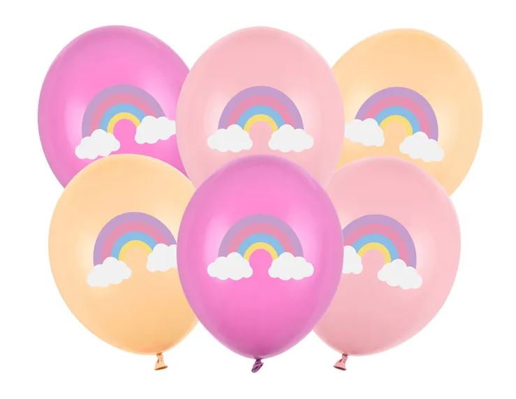 Sex ballonger av hög kvalitet till barnkalaset. Ballongerna kommer i färgerna fuchsia, ljusrosa och orange, och pryds av regnbågstryck på båda sidor. Matcha gärna med övriga produkter i unicorn-temat.