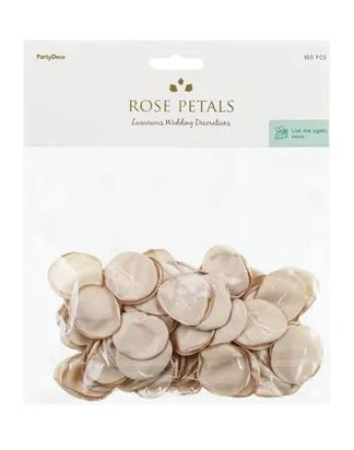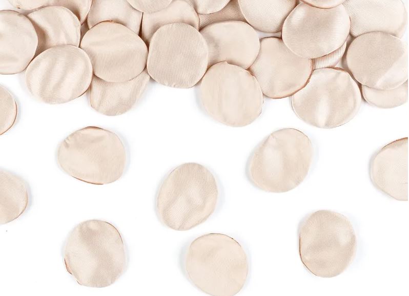 Beige rosblad av tyg, 100 st. Skapa en romantisk och elegant atmosfär med dessa rosblad i vacker beige nyans. Perfekta för bröllop, fester eller andra speciella tillfällen. Varje påse innehåller 100 stycken rosblad.