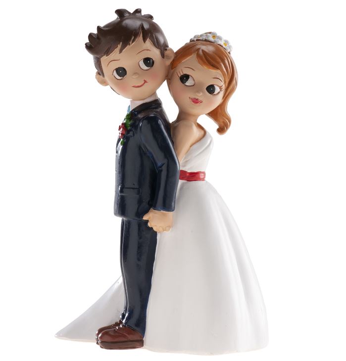 Brudpar till bröllopstårtan från Dekora. Just det här paret håller varandras händer och står rygg mot rygg. Brudparet är ca 16 cm högt och blir en dekorativ detalj till bröllopstårtan.