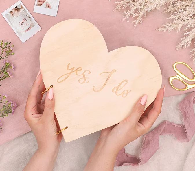 Gästbok till bröllopet med texten "yes, I do". Gästboken är gjord av trä och har formen av ett hjärta. En elegant och romantisk detalj till bröllopsfirandet!