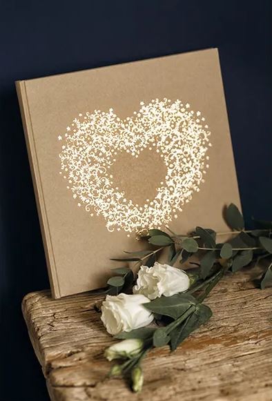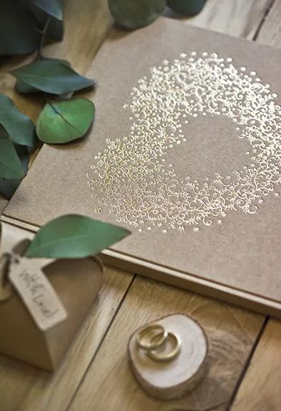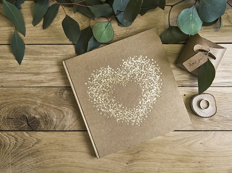 Välkomna dina gäster och bevara minnena från er speciella dag med en vacker gästbok i naturlig stil. Gästboken har en pärm av kraftpapper och ett hjärt-ornament tryckt i guld på framsidan. Den är ca 20,5 x 20,5 cm stor och innehåller 22 blanka sidor för gästerna att fylla med hälsningar.