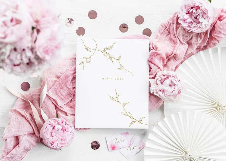 Elegant gästbok i vitt med guldfärgade detaljer. Boken innehåller 22 blanka sidor, helt utan text. Perfekt gästbok till bröllopet.