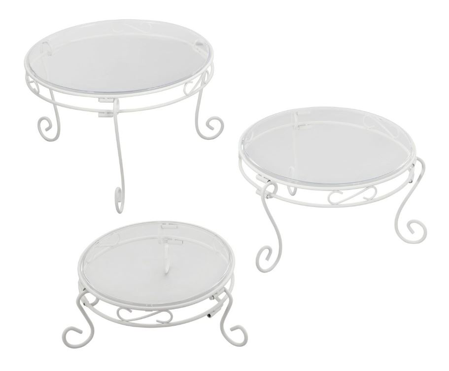 Tårtfaten är tillverkade av vitlackad metall och genomskinliga plastplattor.