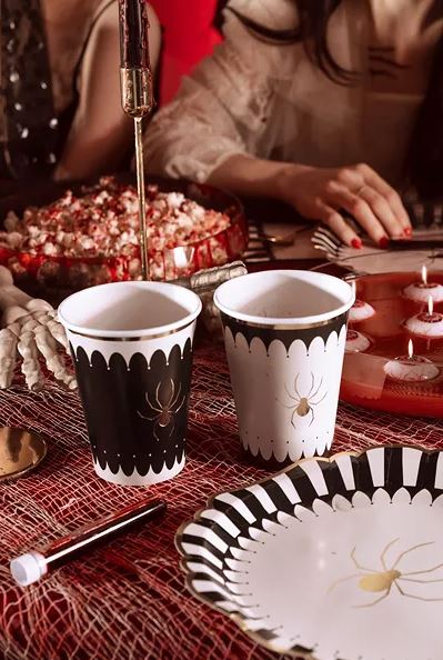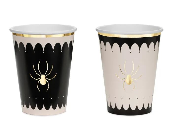 Fira Halloween eller ett läskigt temakalas med stil! Dessa eleganta pappersmuggar i beige och svart med gulddetaljer och spindelmotiv blir en perfekt detalj på bordet. Muggarna rymmer ca 400 ml och passar både barnkalas och vuxenfester med spök- eller spindeltema.