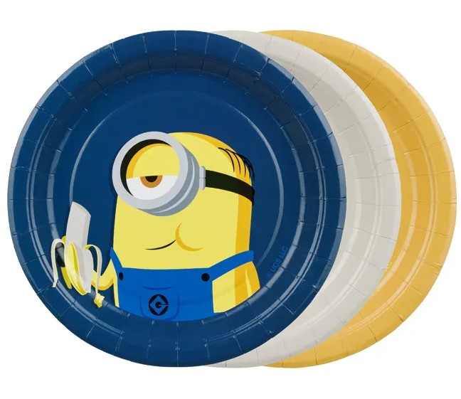 Tallrikarna är gula, vita och blåa med Minioner-tryck, vilket ger dukningen en glad och busig känsla. Passar utmärkt för servering av tårta, snacks eller enklare måltider.
