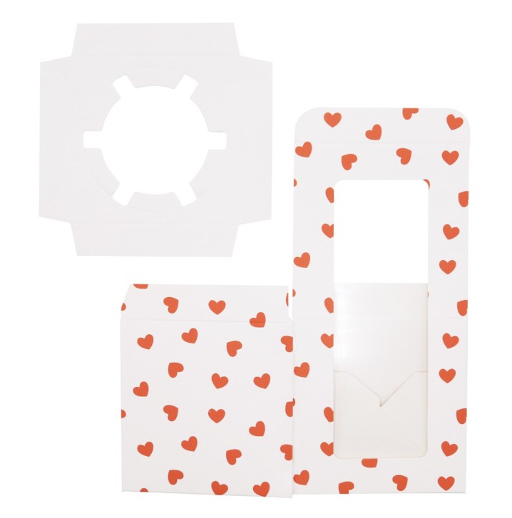 Cupcakesboxarna levereras platta. Tack vare markerade viktlinjer är de enkla att montera. Varje box har dessutom ett fönster som gör det möjligt att kika in – perfekt för romantiska överraskningar!