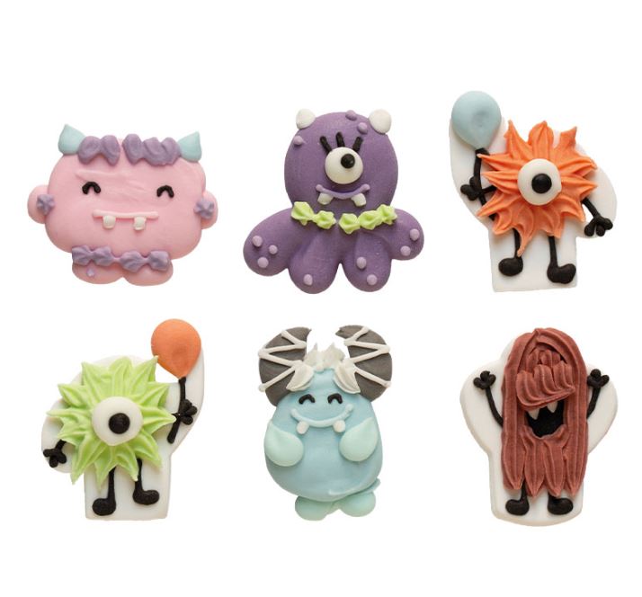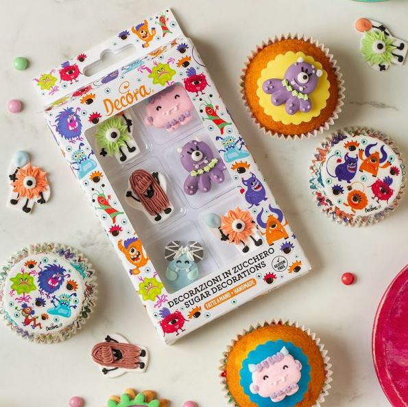 Handgjorda, utsökta sockerdekorationer från Decora i form av söta monster i olika former. Dessa detaljerade monster ger en lekfull och rolig känsla till tårtor, cupcakes och andra bakverk. I förpackningen ingår sex olika monster, med storlekar mellan 2,6 cm till 5 cm i diameter, och höjd ca 4 cm.