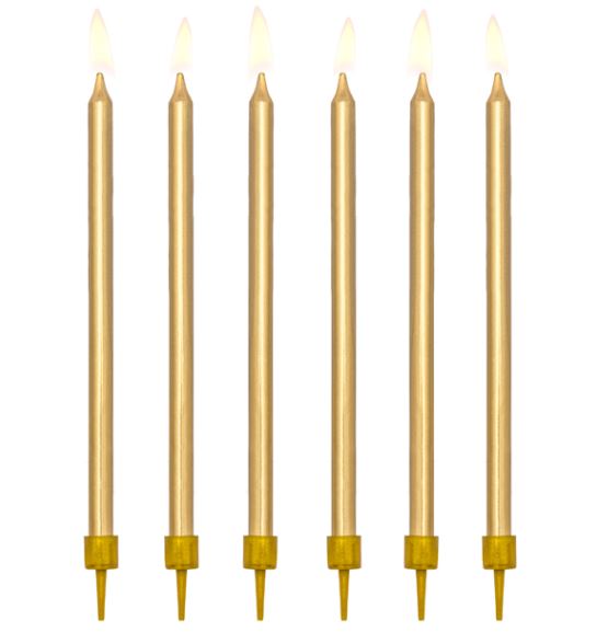 Höga tårtljus i guld till födelsedagstårtan. 12 tårtljus och 12 hållare ingår.