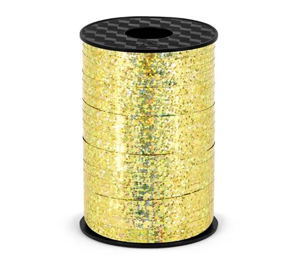 Ballongsnöre i guldskimrande plast för att knyta fast ballonger av alla dess slag. Ballongsnöret är ca 5 mm brett och 225 m långt.