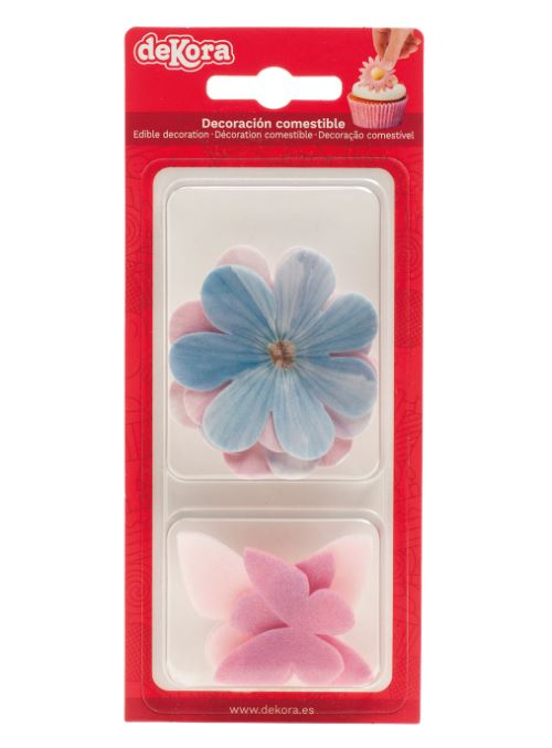 Ätbara fjärilar och blommor gjorda av waferpapper. Blommor i rosa, lila och blått samt fjärilar i två olika storlekar ingår. Använd för att dekorera tårtor, cupcakes och andra bakverk.
