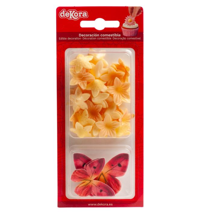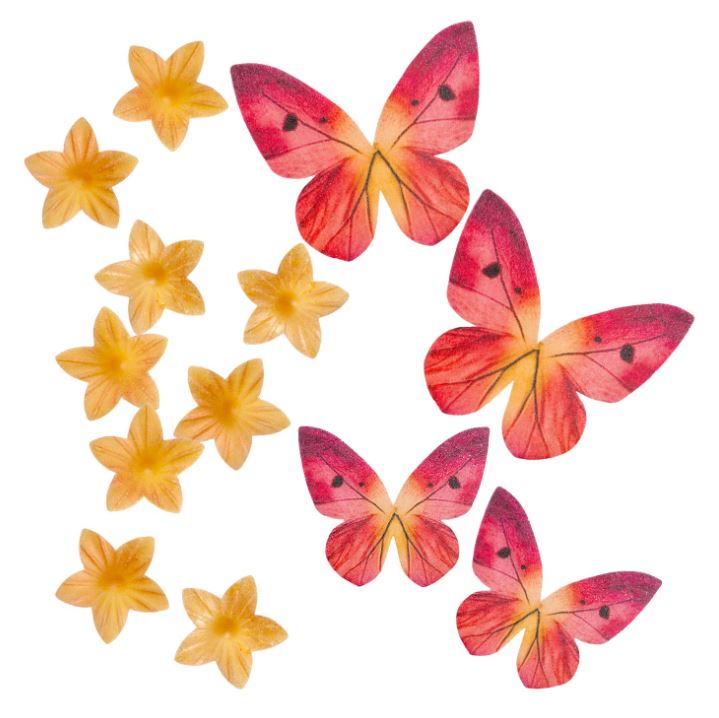 Ätbara fjärilar och blommor gjorda av waferpapper. Fyra röda fjärilar och 35 små gula blommor ingår. Använd för att dekorera tårtor, cupcakes och andra bakverk.