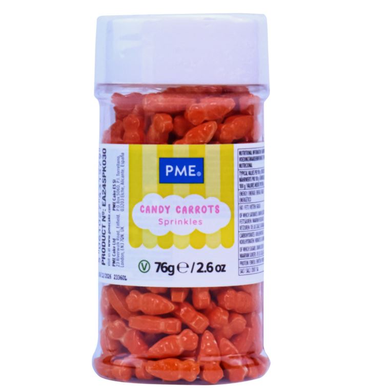 Strössel i form av orangea morötter från PME. Perfekta för att dekorera morotskakor, tårtor och andra bakverk med en festlig touch. De ätbara sockermorötterna levereras i en praktisk burk, redo att strös över dina skapelser!