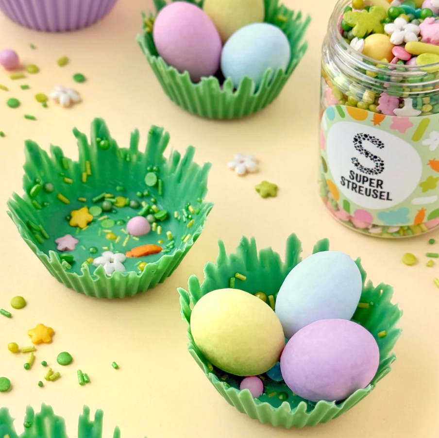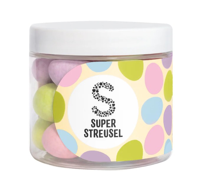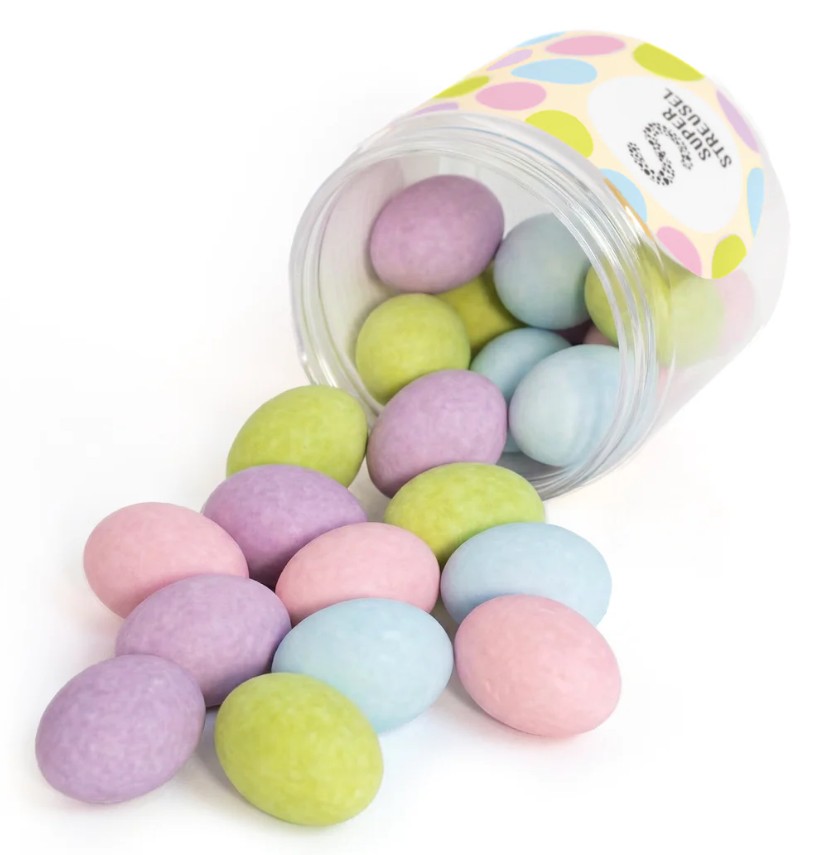 Dessa stora och dekorativa ägg har en oemotståndlig kärna av len hasselnöts- och mjölkfyllning, omgiven av mjuk mjölkchoklad och täckt med ett krispigt, färgglatt sockerskal i härliga pastelltoner.