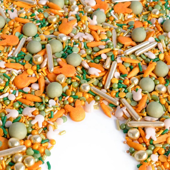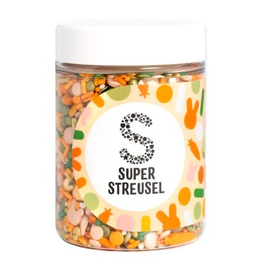 Hopp, hopp – gör plats för Super Streusels påskfina strösselmix! I mixen hittar du lysande orange morotsströssel, små mini-kaniner i ljus beige, stora kaniner i orange, gröna chokladkulor, guldiga mini-krispkulor, guldiga strösselstänger samt små strösselkulor och konfettiströssel i härliga färger som orange, guld och grönt.