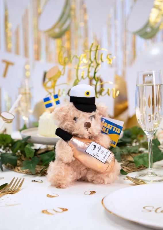 - Design: Beige nalle med studentmössa och rosa bubbelflaska